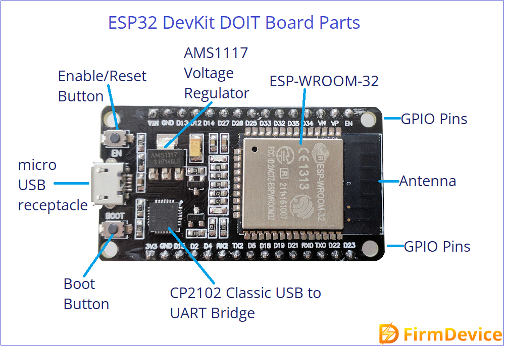ESP32 GPIO examples are brought to you from most famous ESP32 Devkit V1 DOIT board. Remember ESP32 comes in different development boards and with different count pinouts, but same pins of development boards works same, there is no difference. You may see count of pins vary depends on boards but the GPIO pin numbers will be same for all type of development boards.